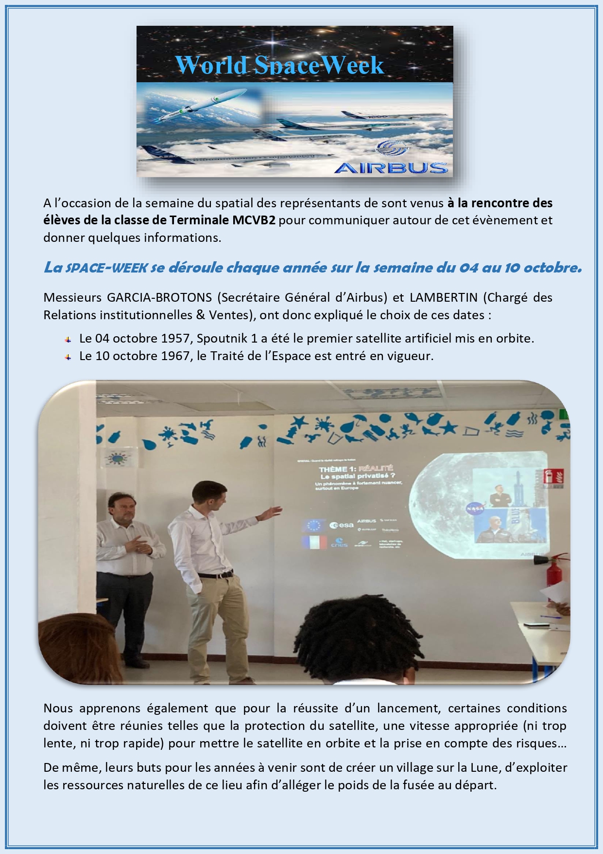 A l’occasion de la semaine du spatial des représentants de sont venus à la rencontre des élèves de la classe de Terminale MCVB2 pour communiquer autour de cet évènement et donner quelques informations.